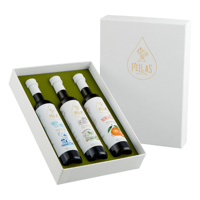 Geschenkset mit 3 Pellas Infused Olivenölen. Griechische Kräuter, Griechische Inseln und extra natives Olivenöl mit Mandarine aus Chios für eine schmackhafte Reise nach Griechenland. Ein fantastisches Geschenk für gesunde Ernährung in einer schönen Verpackung. 3 x 100ml